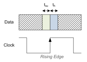 Trong hình, vùng màu xanh lá đại diện cho t su là thời gian thiết lập (SetupTime). Vùng màu xanh dương đại diện cho t h hoặc Thời gian giữ (hold). Trong các khu vực này, dữ liệu vào Flip-Flop có thể là 0 hoặc 1 hoặc lơ lững (không rõ ràng 0 hay 1).