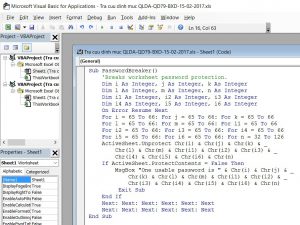 Trên cây thư mục VBAProject, double click lên Sheet, copy code sau dán vào cửa sổ bên trái