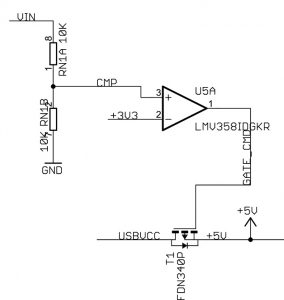 Nguồn 5 V từ USB cung cấp cho mạch arduino qua một P-Mosfet (T1) hoạt động như một bộ chuyển đổi nguồn. Mosfet được điều khiển bởi một bộ khuếch đại LMV358 hoạt động như bộ so sánh. Đầu âm của LMV358 được nối với nguồn 3.3 V, đầu còn lại nối với bộ phân áp 50% từ điện áp vào Vin.