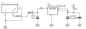Đây là nguồn điện ngoài cung cấp cho arduino (PWRin, Giắc cắm) thông thường được cung cấp từ 7v đến 12V. Nguồn này đi qua một diode D1 (để tránh cắm ngược nguồn). Sau đó, được ic ổn áp NCP1117 chuyển đổi thành điện áp 5V cung cấp cho các bộ phận sử dụng nguồn 5V trong mạch.